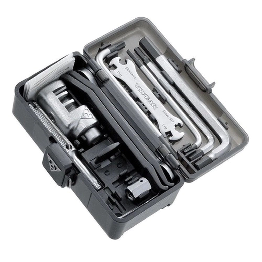 Multiferramentas de 30 funções embaladas em uma caixa de proteção personalizada que pode ser montada em qualquer tubo redondo ou canote do selim (25 mm - 33 mm) com uma alça de liberação rápida segura.